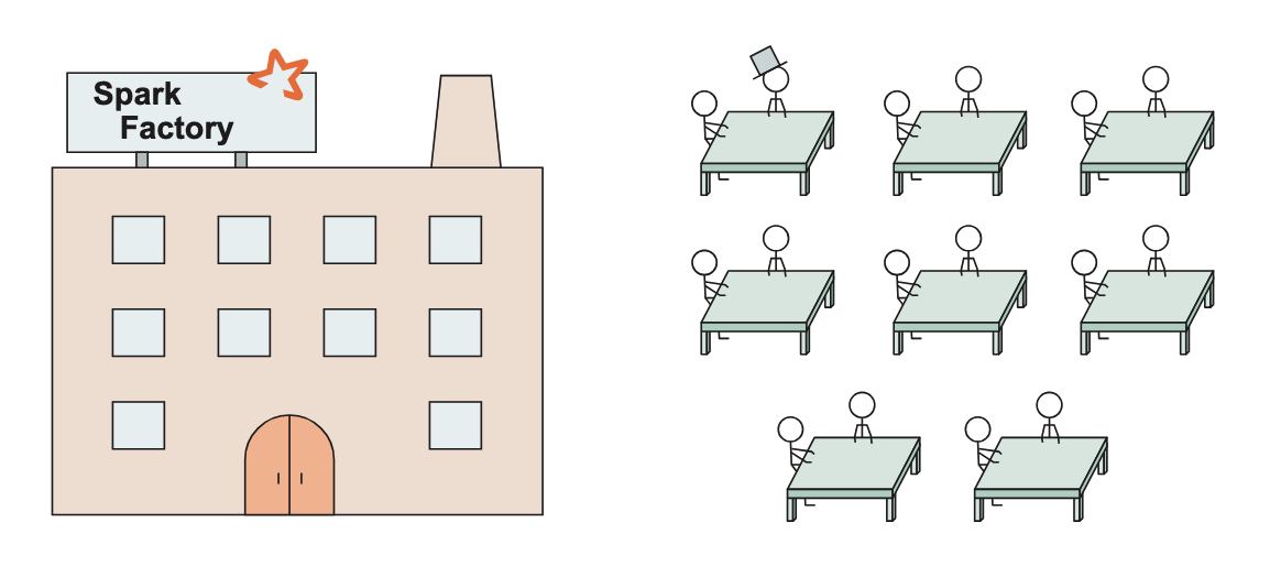 - The master node is represented by the figure wearing the hat — think of it as the factory manager or owner. It allocates tasks to each workstation and oversees the workflow across the factory.